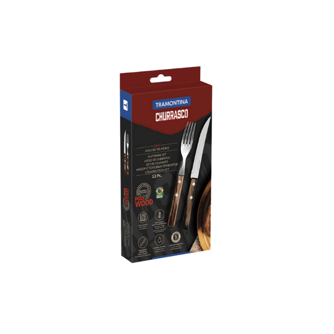 Juego de cubiertos para asado Tramontina de acero inoxidable con mango castaño Polywood, 12 piezas