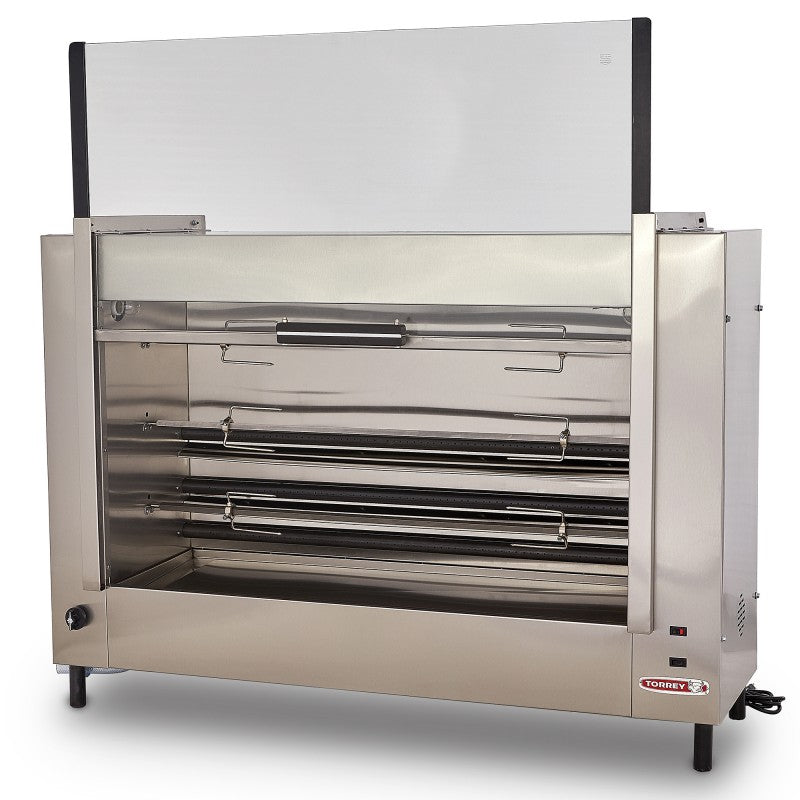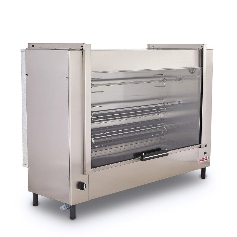 Rosticero de gas fabricado en acero inoxidable con capacidad para 27 pollos, espacio para exhibición caliente.